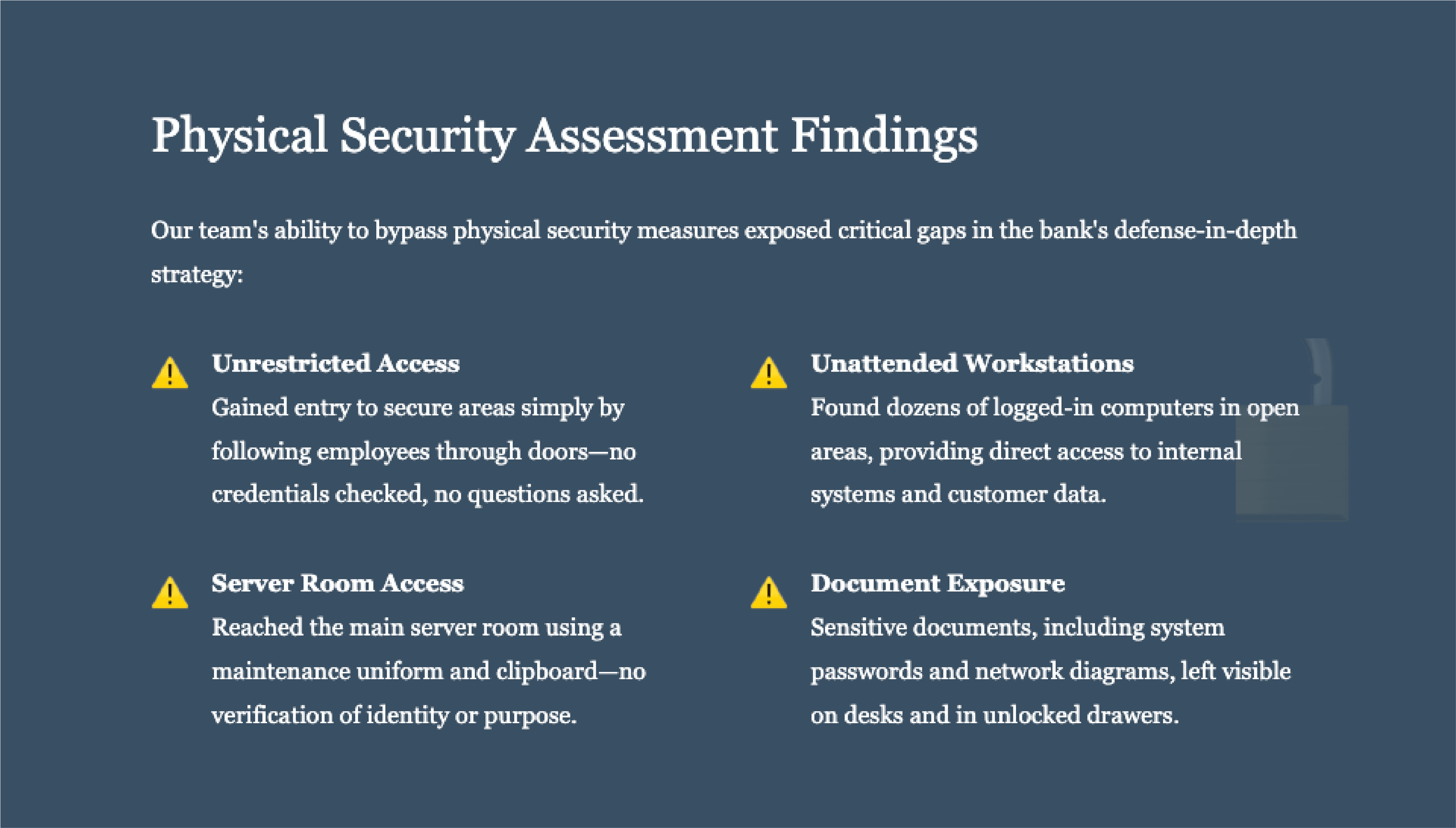As concerning as the digital vulnerabilities were, our physical security assessment revealed an equally troubling reality. Security, we discovered, is only as strong as its weakest link—and often, that link is human.