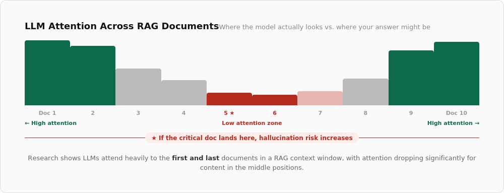 LLMs have a strange quirk about where they place their attention. If the RAG has 10 documents for context, research shows LLMs pay attention to the beginning and end of the list. What if the really important piece of information is in the middle? The chance of hallucination increases.