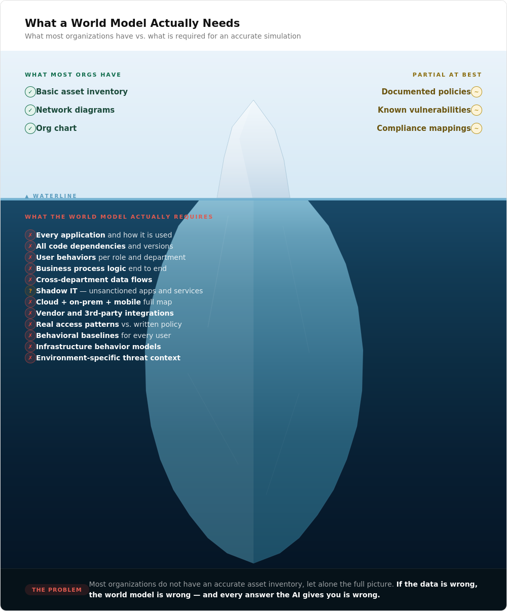 You’ll need to provide the data for an accurate simulation of your environment — every asset, business process, user, vulnerability, piece of code, etc. Then you also need behaviors for that system. Think of your own behavior on any given day; now write down a model which provides all the details about that behavior mapped to your systems. Now, go and build this for each department — finance, HR, engineering, IT, marketing — and all your infrastructure, from stuff in the cloud to mobile devices and more. And don’t forget to map how people purchase and use unsanctioned apps (the infamous “shadow IT”). In the real world most organizations do not have an accurate asset inventory, let alone all that data. And if the data is wrong, then the world model will be wrong, and any answer you get from the AI will be wrong.